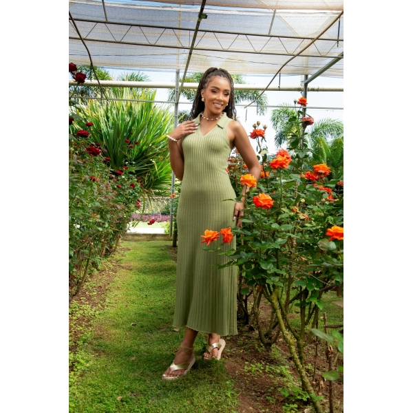 Vestido canelado no Modal, estruturado pelo decote em V e a gola polo.
